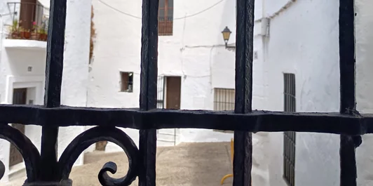 Depuis le petit salon, la vue sur la place — l’une des plus anciennes de Vejer — crée une ambiance immédiatement reconnaissable : minérale, authentique, presque cinématographique.