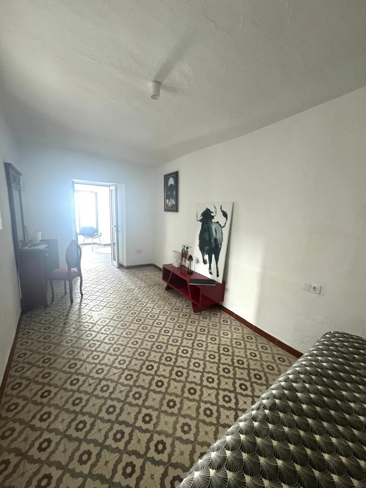 La Suite Toro offre une arrivée différente d’un hébergement classique. Vous entrez par un petit salon qui fait office d’entrée indépendante et qui ouvre également sur la place. Ce premier espace donne le ton : une suite qui se vit comme un appartement intime, tout en restant connectée à l’atmosphère de Vejer.